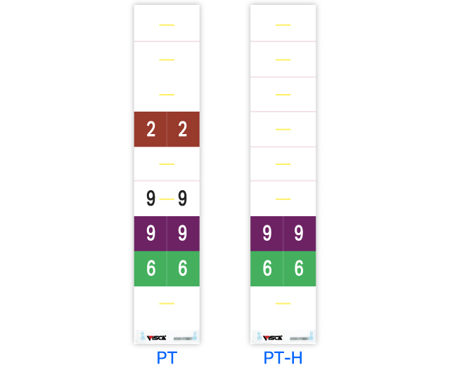 「0」と「1」の配色は、TD2 と同様、「0」=白 「1」=黒です。印刷工程の違いによりTD2 と若干色味が変わります。また、飛び番号が多いなどの理由で 00 番から 99 番まで2 桁のカラーコード部分だけを印刷した PT-H もございます。