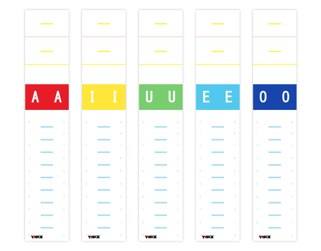 50音整理システム用のカラーシートです。母音(A、I、U、E、O)を印刷したシートに、子音を示すカラーアルファベットラベルを貼ることで姓名の50音を表示します。