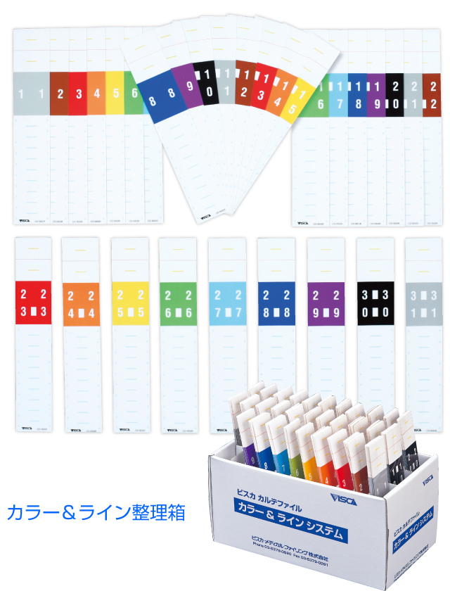 これまではファイルや書類・資料にバラバラのカラーラベルを貼付していましたが、ビスカは初めて、数字や文字を短冊形のシートに印刷したカラーシートを開発し、フォルダーのポケットに差し込むだけで、すぐにカラーファイリングが可能になりました。